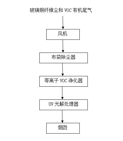 玻璃鋼噴涂固化車間內(nèi)噴射機(jī)將玻璃鋼纖維與合成樹(shù)脂混合噴射,其中玻璃鋼纖維塵與合成樹(shù)脂中的揮發(fā)性有機(jī)尾氣為主要污染物,擬采用側(cè)吸式集氣罩將密封操作間內(nèi)的浮塵與合成樹(shù)脂中揮發(fā)的有機(jī)尾氣集中收集,通過(guò)管道送入布袋除塵器,首先過(guò)濾回收玻璃鋼纖維塵,經(jīng)過(guò)濾后有機(jī)尾氣進(jìn)入等離子VOC凈化器進(jìn)行吸附-分解-裂解過(guò)程,然后進(jìn)入U(xiǎn)V光解處理器,利用紫外線催化空氣產(chǎn)生臭氧,在臭氧和紫外線雙重作用下,催化裂解有機(jī)廢氣。最終清潔氣體排入大氣。